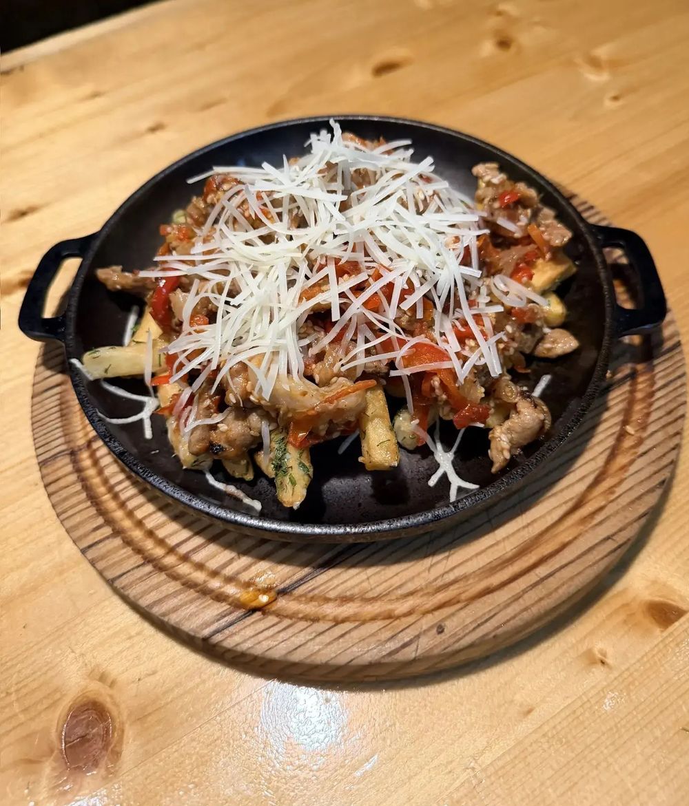 Свиная вырезка, картофель фри, перец болгарский , томат, лук репчатый, сыр твёрдых сортов , кунжут