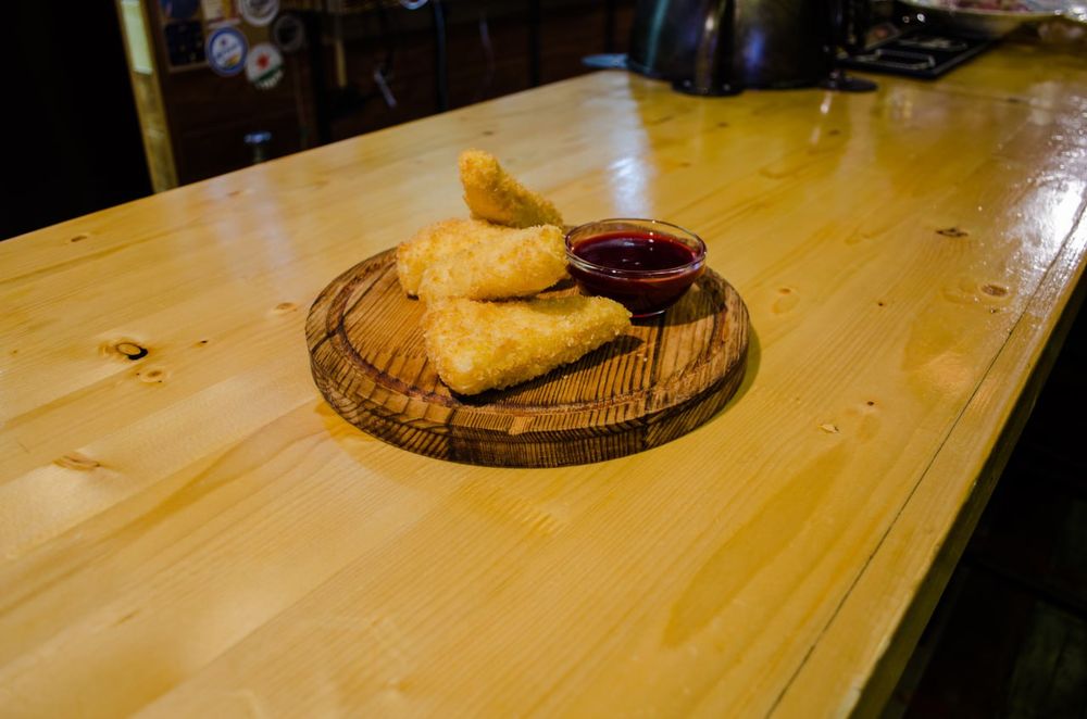 Сыр Сулугуни в хрустящей панировке, подается с ягодным соусом.