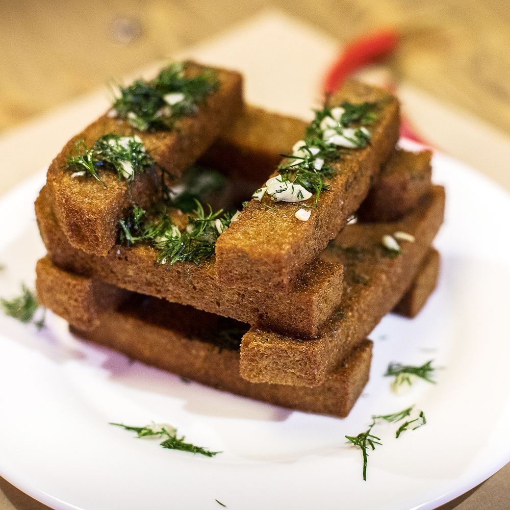 Ароматные хрустящие гренки из ржаного хлеба с чесноком и зеленью.
