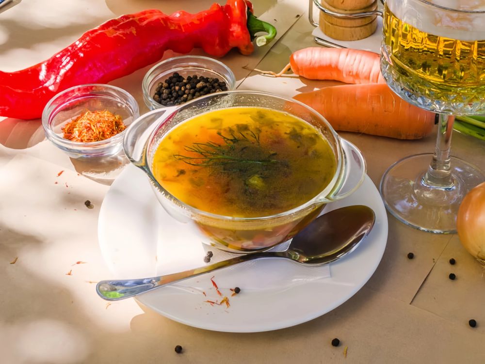 Говядина, говяжий бульон, зелень, зелёное масло, томаты, болгарский перец, свежий сельдерей, свежий чеснок, репчатый лук.
