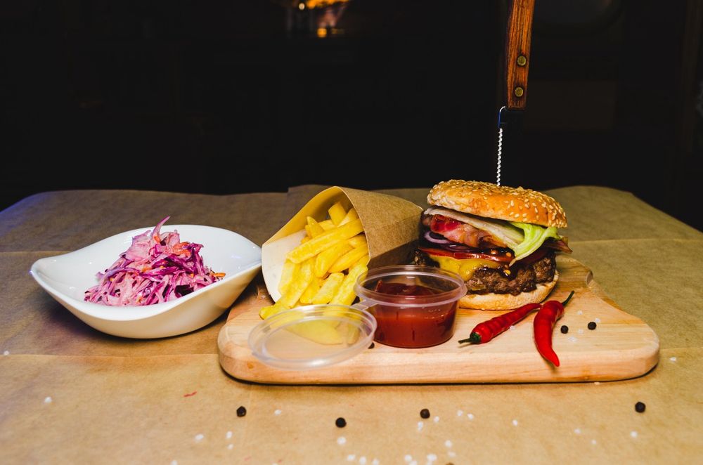 Котлета из говядины зернового откорма , бекон, томат, маринованный огурчик, салат айсберг, сыр, соус, булочка с кунжутом. Подается с картофелем фри+соус ,и салатом коул-слоу.